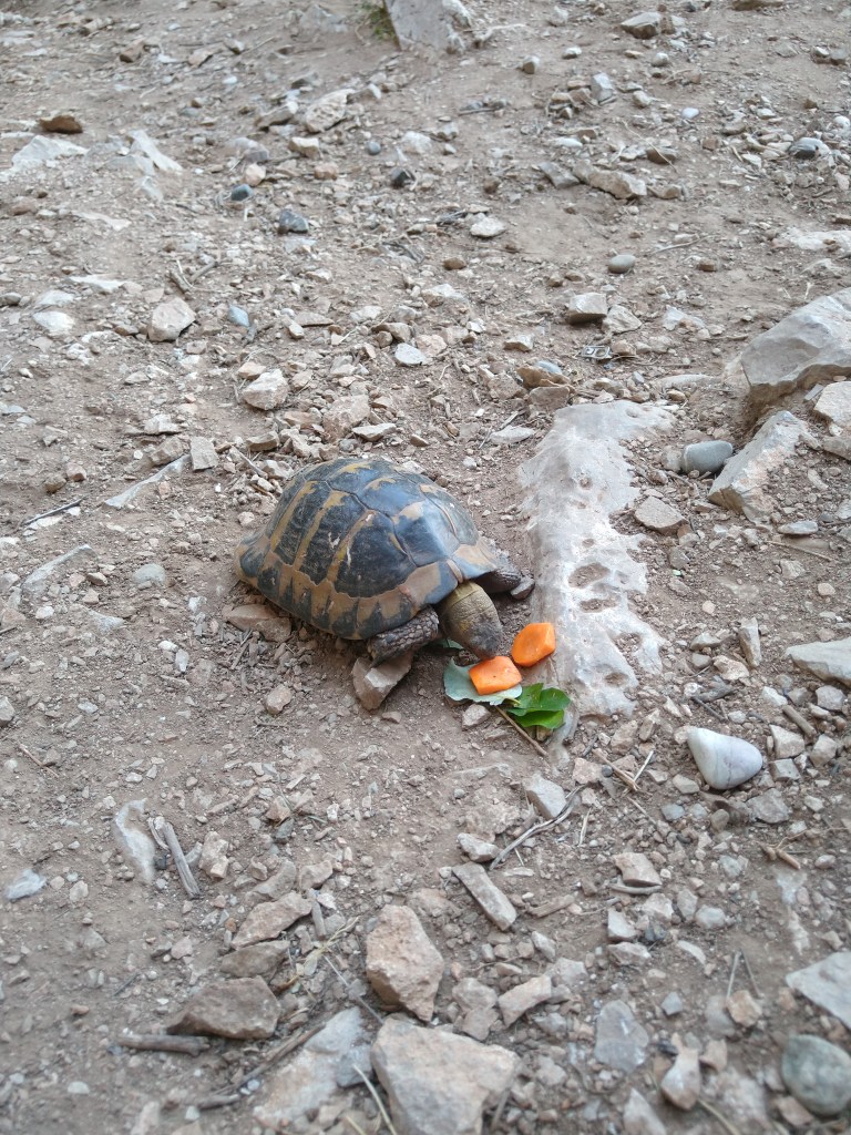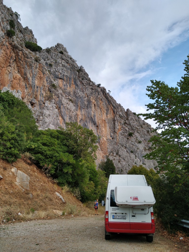 Und auch die Liste der Tiere, die uns auf unserer Reise begegnet sind, konnten wir um eine Spezies erweitern: Griechische Landschildkröten! 🙂 Sowohl am Straßenrand, als auch auf dem Zustieg oder sogar direkt neben uns am Fels zeigten sich die kleinen Panzertiere.