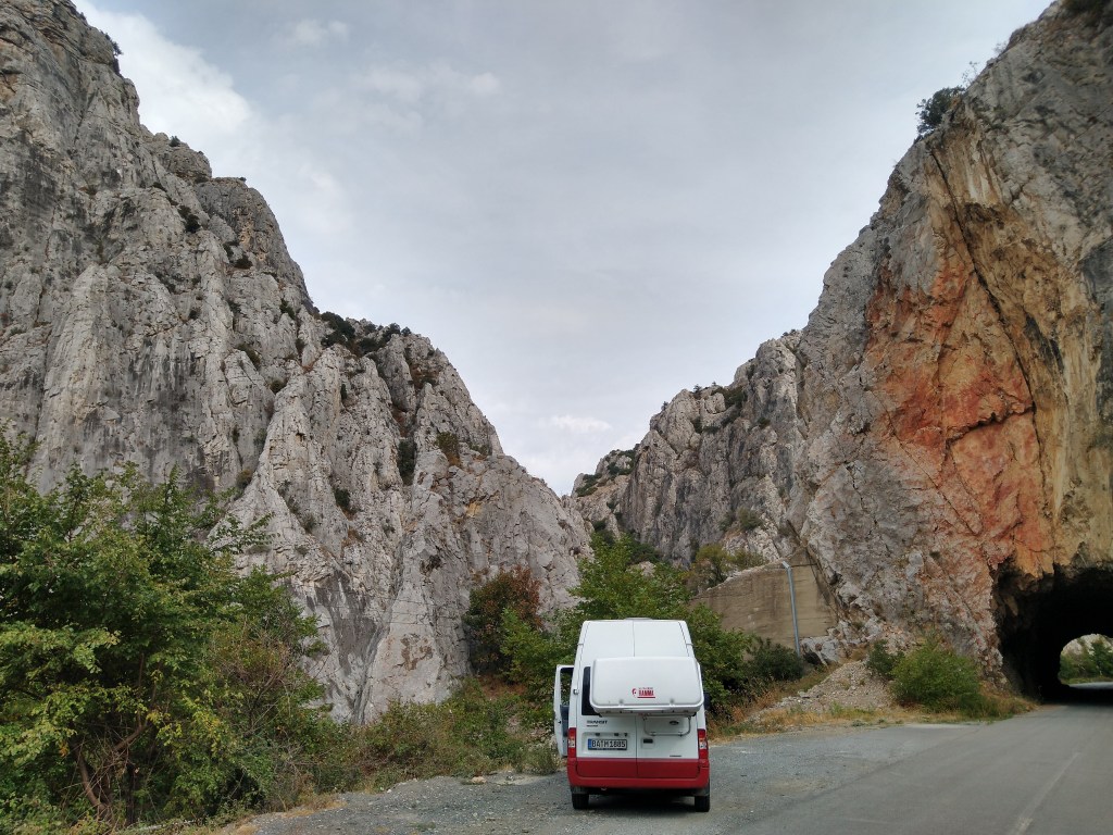 Wir verbrachten einige Klettertage in Demir Kapija Canyon, einem toll angelegten Klettergebiet in der dortigen Schlucht. Vom Camp aus kann man die Felsen zu Fuß erreichen. Da man hierfür jedoch ohne wirklichen Gehsteig neben LKWs durch einen Tunnel muss, entschieden wir uns nach dem Auskundschaften doch für das Auto 😉