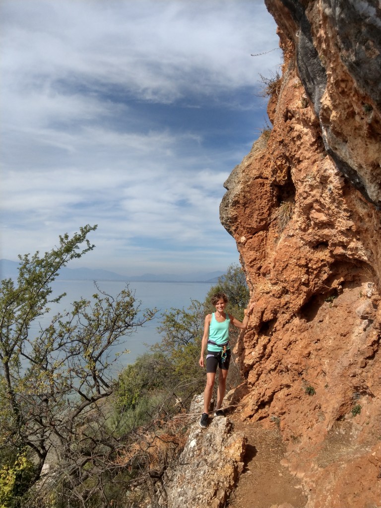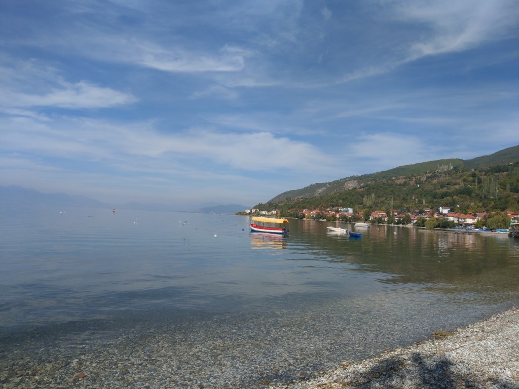 Nachdem uns mehrfach dazu geraten wurde, verlängerten wir den geplanten Aufenthalt in Nordmazedonien um einen Umweg über den Ohridsee zu machen. Beim Ohridsee handelt es sich um einen der ältesten und tiefsten Seen der Welt. Er liegt auf über 600 Metern Höhe und wird von unterirdischen Quellen gespeist. Der Ohridsee gehört zum größeren Teil zu Nordmazedonien, dessen größtes Gewässer er ist, zum kleineren Teil zu Albanien. Anfang Oktober waren die Ortschaften und Strände entlang des Sees größtenteils ausgestorben. Wir nutzten das bessere Wetter für einen Klettertag mit direktem Zugang zum See – zum Baden war es uns aber trotzdem zu kalt – und ließen uns auch den bekannten Ohridkarpfen nicht entgehen.