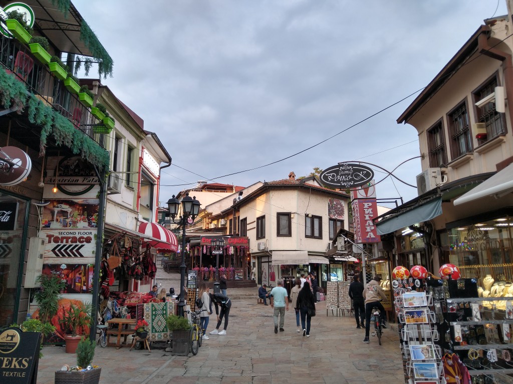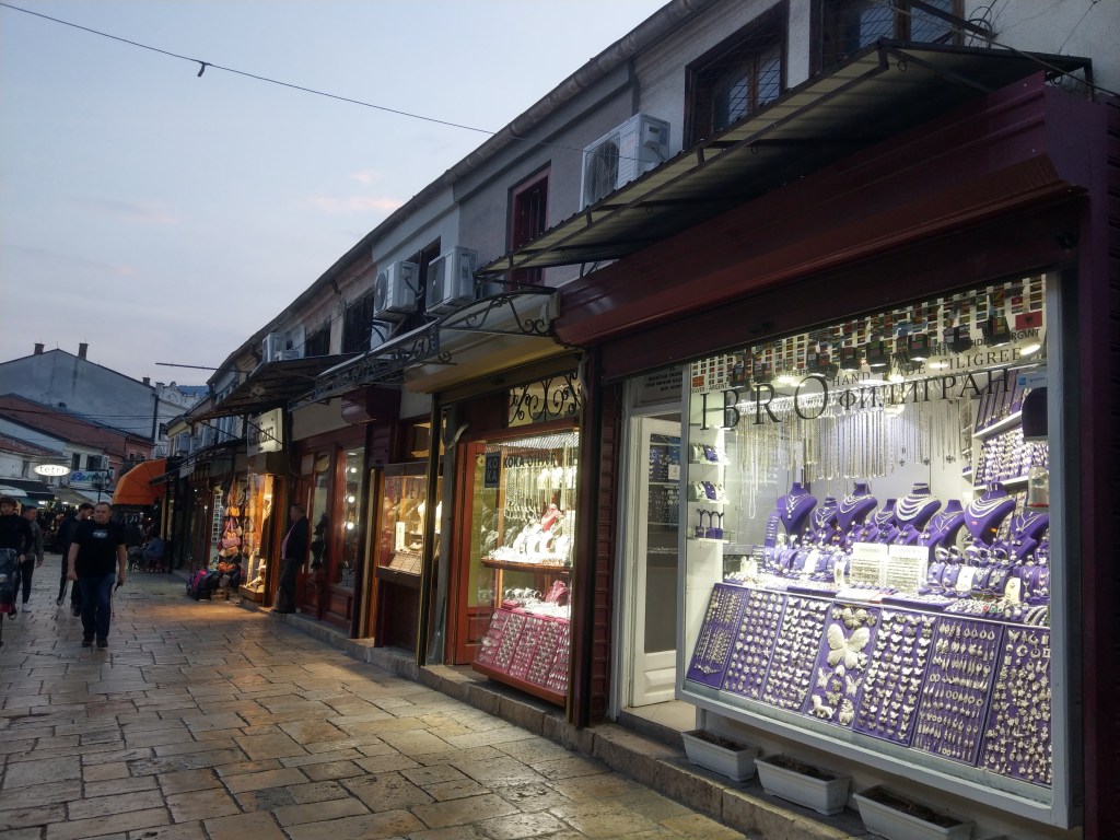 Die nördlich gelegene Altstadt zentriert sich um das alte Marktviertel Stara Čaršija und den berühmten Bit Bazar (alter Bazar). Die dort zu findende Art von Läden für Gold- und Silberschmuck und Stände mit (gefälschten) Sport- und Markenprodukten, Obst, Gemüse, Gewürzen und allerlei Gemischtwaren begegnete uns selbst in den kleinsten Städten Nordmazedoniens.