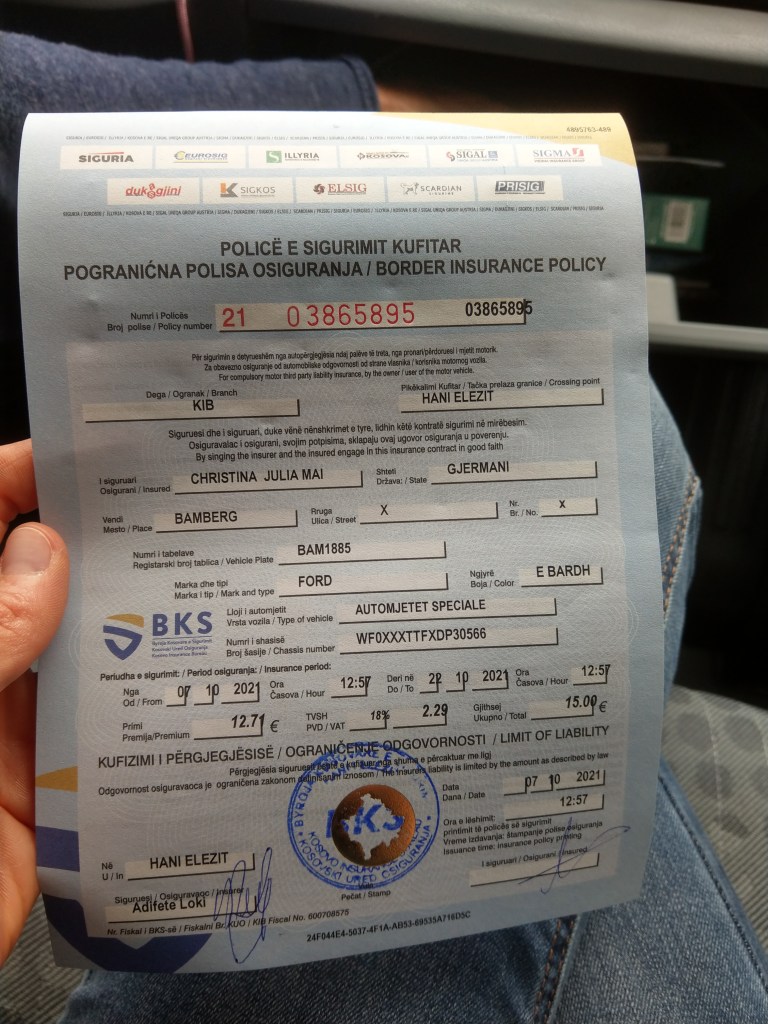 Weiter ging die Fahrt in Land Nummer 6 seit Beginn unserer Reise: dem Kosovo. Und zum ersten Mal reichen Ausweise, grüne Versicherungskarte und CovPass App nicht aus um in das Land einzureisen. Der Kosovo erkennt als eines der wenigen Länder in Europa die grüne Versicherungskarte nicht an, es muss an der Grenze eine eigene Versicherung (15 Euro – auch der Kosovo verwendet wie Montenegro, obwohl nicht in der EU, den Euro als Währung) für das Auto abgeschlossen werden. Bereits im Verkaufshäuschen fällt uns das auf, was uns im Nachhinein mit am Deutlichsten in Erinnerung geblieben ist: es wird immer und überall geraucht. Wir hatten tatsächlich schon fast vergessen, wie es ist mit tränenden Augen in geschlossenen Räumen zu sitzen und nach Rauch stinkende Haare und Klamotten zu haben.