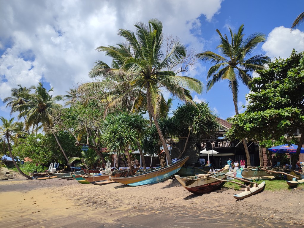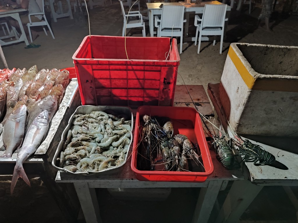 Wir suchten uns eine Unterkunft im Badeort Mirissa und waren so begeistert, dass wir gleich für 5 Nächte dort blieben. Am Abend wurden die Strandliegen gegen Tische und Stühle ausgetauscht und die Fischfänge des Tages vor den Lokalen ausgebreitet. Für Michi ein Schlaraffenland und eine allabendliche Qual der Wahl.