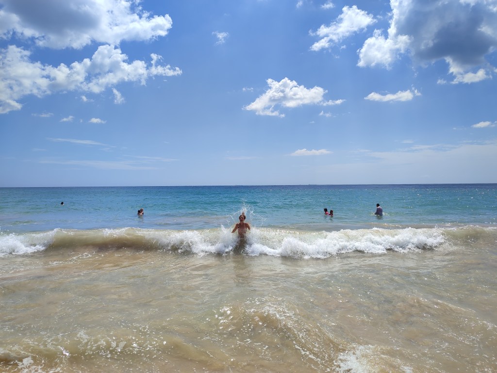 Und dann war es endlich da: das Meer! Besser gesagt der indische Ozean. Mit schier endlosen Sandstränden, Badewannen warmem Wasser und mannshohen Wellen, die zum Baden und Tollen einladen. Oder einen einfach umschmeißen 😉