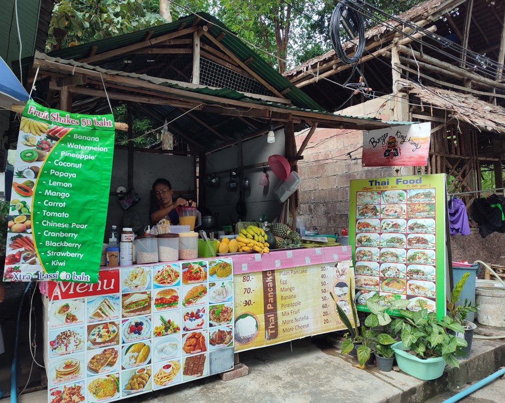 Außer uns befinden sich noch ca. 20 andere Kletterer und genauso viele Einheimische in Tonsai. Weitere Touristen gibt es so gut wie keine. Wir fühlen uns fast ein bisschen wie auf einer einsamen Insel und genießen die Entspanntheit des Lebens hier. Essensmöglichkeiten gibt es zwar nicht viele, dafür ist die Qualität aber umso besser – auch wenn der erste Eindruck dies nicht immer vermuten lässt. Die Auswahl an Speisen ist groß und alles wird frisch zubereitet. Wir sind immer wieder beeindruckt, was die Muttis mit den einfachen Mitteln hier in kürzester Zeit zaubern können.