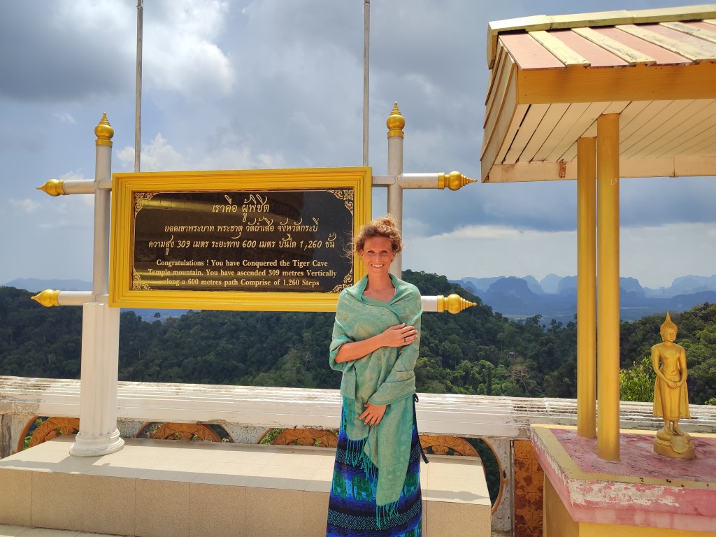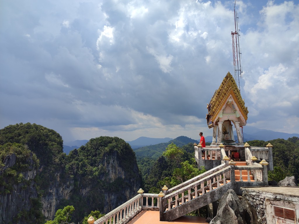 Eine der Hauptattraktionen in der Gegend hier ist der Tiger Cave Tempel, ein buddhistischer Tempel, der bekannt ist für die große Buddha Statue auf dem Gipfel und die steilen Stufen, die auf diesen hinauf führen. Insgesamt gilt es 1.260 Stufen mit stark variierenden Stufenhöhen von bis zu einem halben Meter zu erklimmen – und unterwegs noch den Affen auszuweichen, die darauf lauern, den Touristen Essbares zu stibitzen. Sagen wir es mal so, Chrissi hatte mehr Respekt vor den Affen als anders herum 😉 Bei über 30 Grad und einer Luftfeuchte von 80% führte der 60 minütige Aufstieg zu nicht endend wollenden Schweißausbrüchen, die jedoch mit einem atemberaubenden Ausblick vom Gipfel entschädigt wurden.